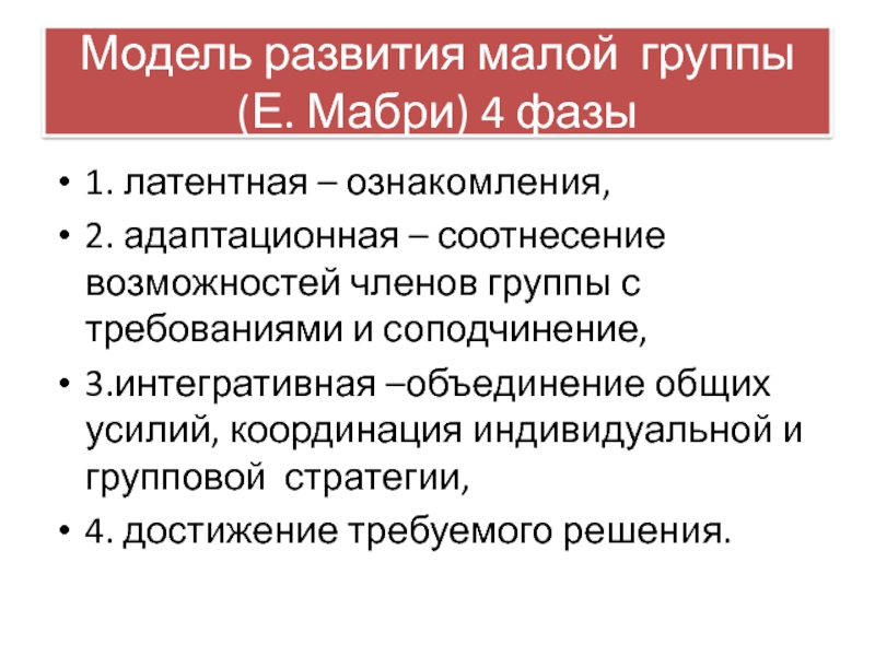 Слайд 15Модель развития малой группы (Е. Мабри) 4 фазы