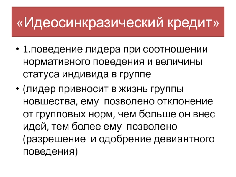 (лидер привносит в жизнь группы новшества, ему позволено отклонение от групповых норм, чем больше он внес идей, тем более ему позволено (разрешение и одобрение девиантного поведения)