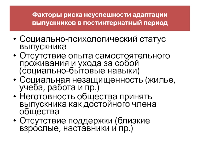 Слайд 12Факторы риска неуспешности адаптации выпускников в постинтернатный период