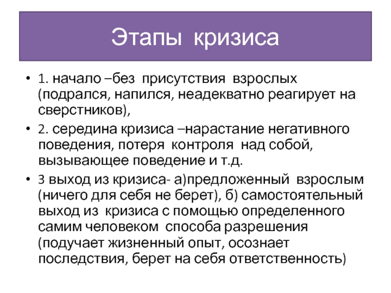 2. середина кризиса –нарастание негативного поведения, потеря контроля над собой, вызывающее поведение и т.д.