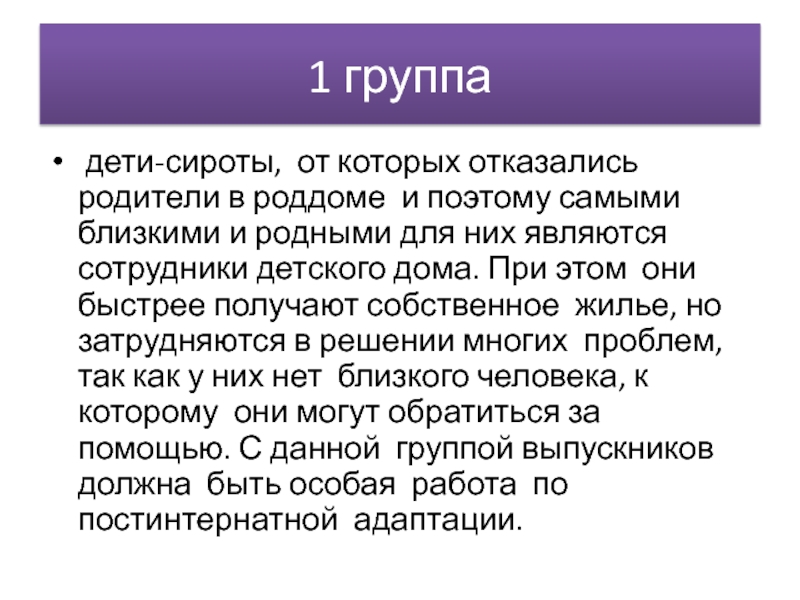 самыми близкими и родными для них являются сотрудники детского дома. При этом они быстрее получают собственное жилье, но затрудняются в решении многих проблем, так как у них нет близкого человека, к которому они могут обратиться за помощью. С данной группой выпускников должна быть особая работа по постинтернатной адаптации.