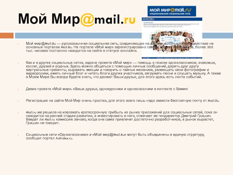 действия на основных порталах Mail.Ru. На портале «Мой мир» зарегистрировано свыше 40 млн. профайлов, более 300 тыс. человек постоянно находятся на сайте в статусе «онлайн».