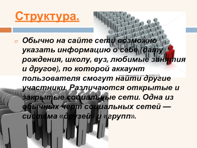 школу, вуз, любимые занятия и другое), по которой аккаунт пользователя смогут найти другие участники. Различаются открытые и закрытые социальные сети. Одна из обычных черт социальных сетей — система «друзей» и «групп».