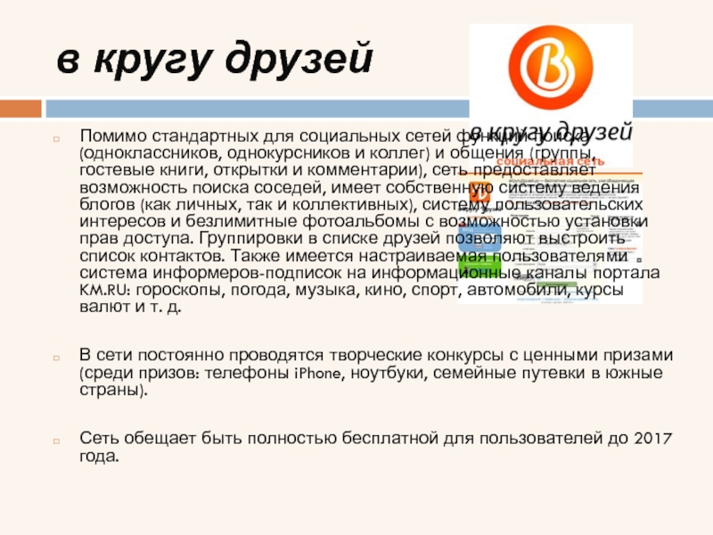 и коллег) и общения (группы, гостевые книги, открытки и комментарии), сеть предоставляет возможность поиска соседей, имеет собственную систему ведения блогов (как личных, так и коллективных), систему пользовательских интересов и безлимитные фотоальбомы с возможностью установки прав доступа. Группировки в списке друзей позволяют выстроить список контактов. Также имеется настраиваемая пользователями система информеров-подписок на информационные каналы портала KM.RU: гороскопы, погода, музыка, кино, спорт, автомобили, курсы валют и т. д.