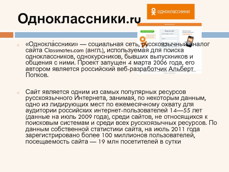 поиска одноклассников, однокурсников, бывших выпускников и общения с ними. Проект запущен 4 марта 2006 года, его автором является российский веб-разработчик Альберт Попков.