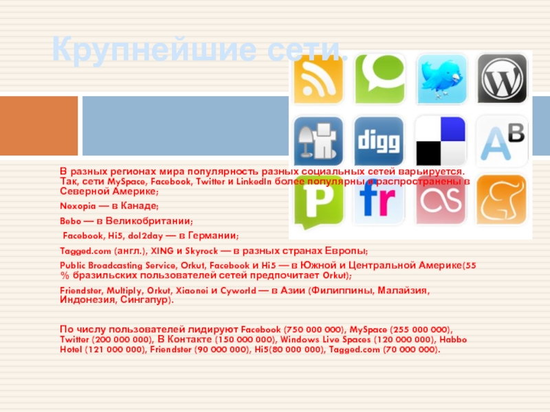 MySpace, Facebook, Twitter и LinkedIn более популярны и распространены в Северной Америке;