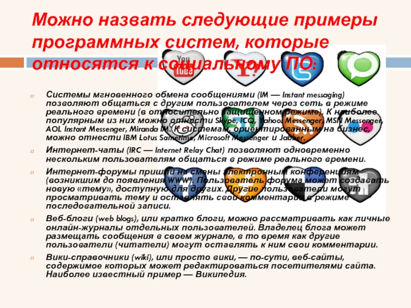 Слайд 17Можно назвать следующие примеры программных систем, которые относятся к социальному ПО: