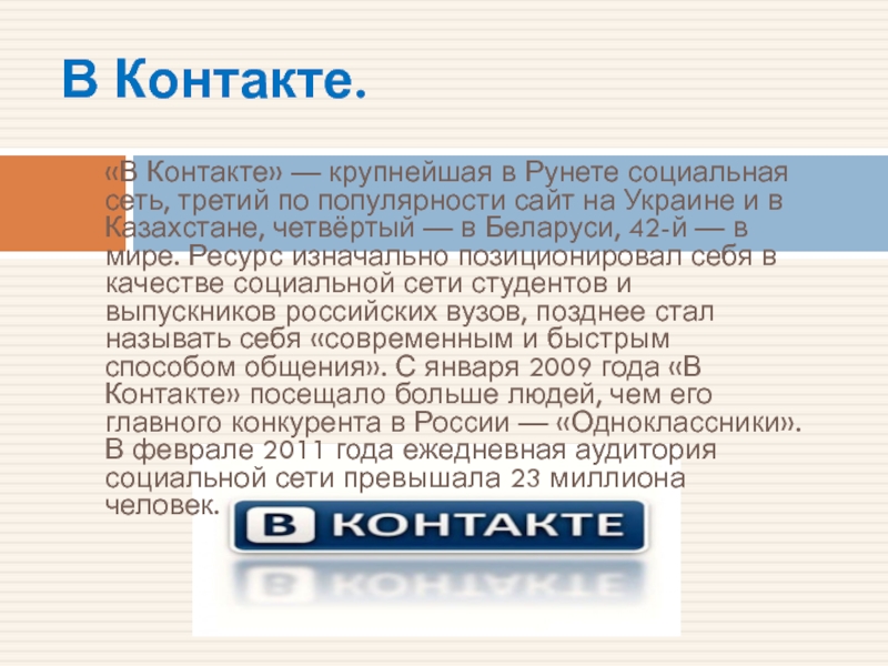 сайт на Украине и в Казахстане, четвёртый — в Беларуси, 42-й — в мире. Ресурс изначально позиционировал себя в качестве социальной сети студентов и выпускников российских вузов, позднее стал называть себя «современным и быстрым способом общения». С января 2009 года «В Контакте» посещало больше людей, чем его главного конкурента в России — «Одноклассники». В феврале 2011 года ежедневная аудитория социальной сети превышала 23 миллиона человек.