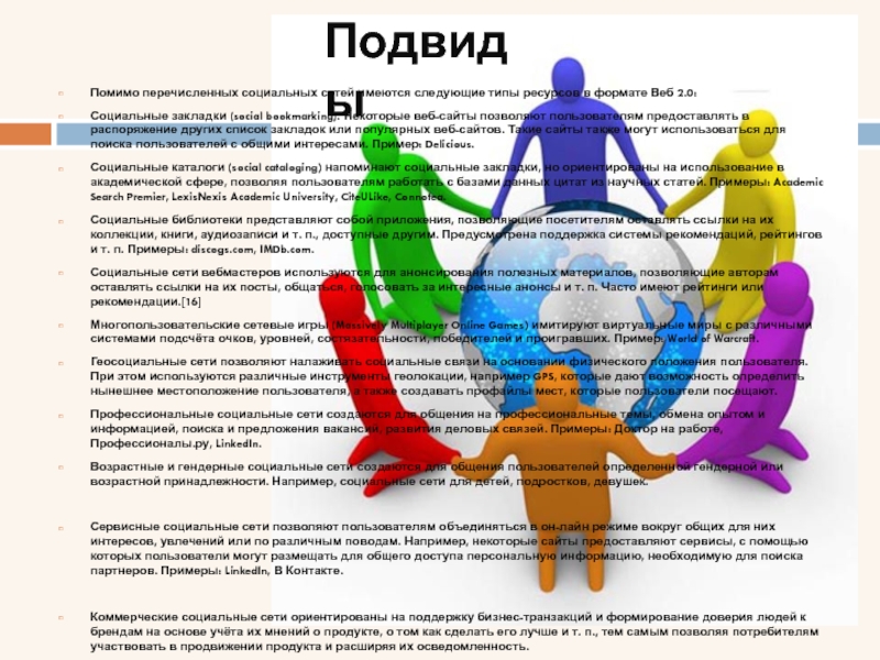 Помимо перечисленных социальных сетей имеются следующие типы ресурсов в формате