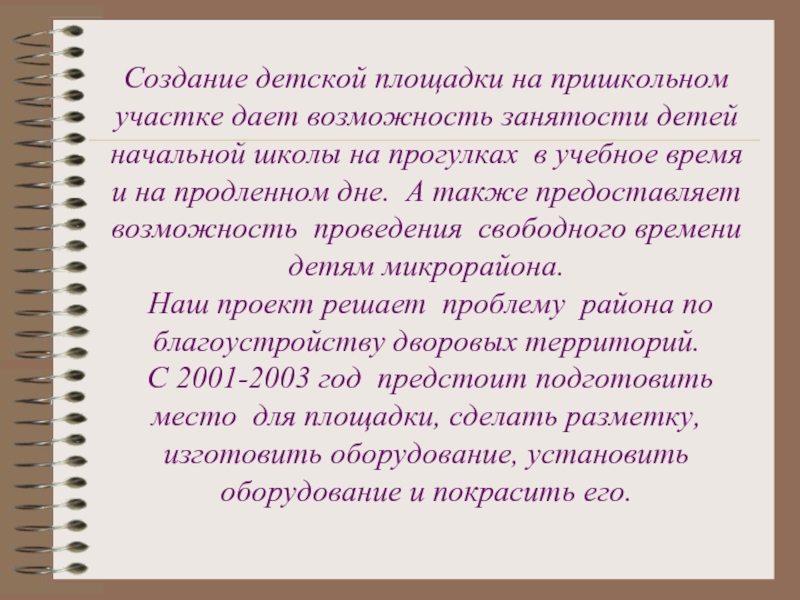 Слайд 3Создание детской площадки на пришкольном участке дает возможность занятости детей начальной