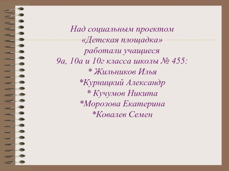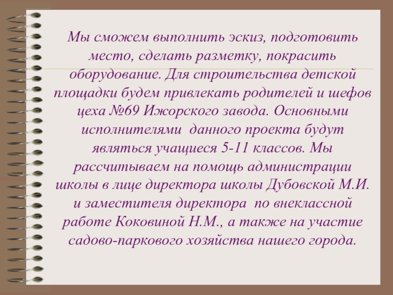 строительства детской площадки будем привлекать родителей и шефов цеха №69 Ижорского завода. Основными исполнителями данного проекта будут являться учащиеся 5-11 классов. Мы рассчитываем на помощь администрации школы в лице директора школы Дубовской М.И.