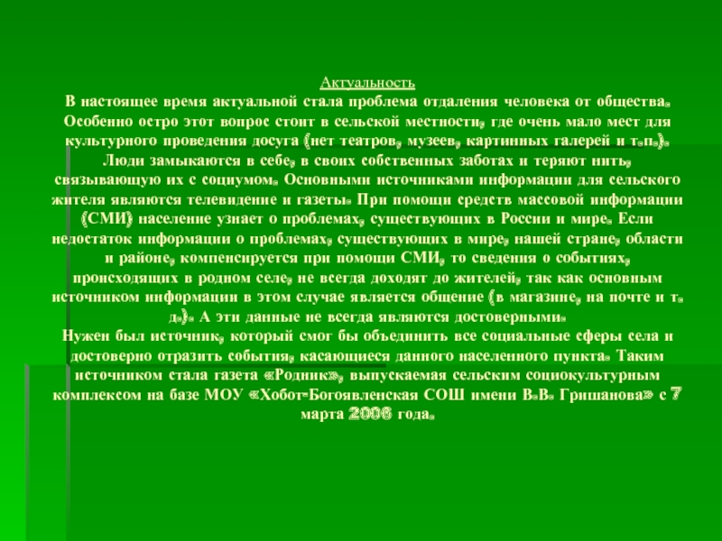 остро этот вопрос стоит в сельской местности, где очень мало мест для культурного проведения досуга (нет театров, музеев, картинных галерей и т.п.). Люди замыкаются в себе, в своих собственных заботах и теряют нить, связывающую их с социумом. Основными источниками информации для сельского жителя являются телевидение и газеты. При помощи средств массовой информации (СМИ) население узнает о проблемах, существующих в России и мире. Если недостаток информации о проблемах, существующих в мире, нашей стране, области и районе, компенсируется при помощи СМИ, то сведения о событиях, происходящих в родном селе, не всегда доходят до жителей, так как основным источником информации в этом случае является общение (в магазине, на почте и т.д.). А эти данные не всегда являются достоверными.