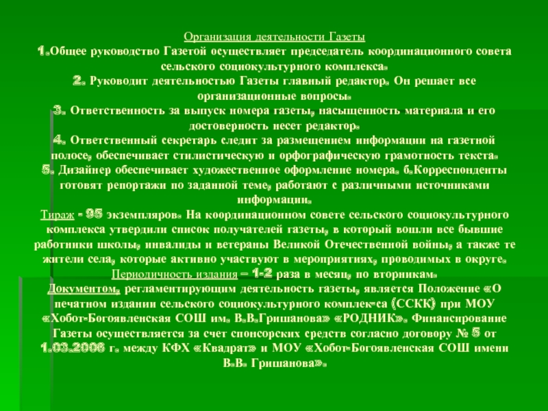 1.Общее руководство Газетой осуществляет председатель координационного совета сельского социокультурного