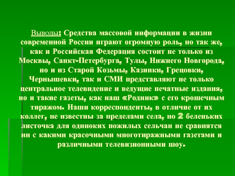 но так же, как и Российская Федерация состоит не только из Москвы, Санкт-Петербурга, Тулы, Нижнего Новгорода, но и из Старой Козьмы, Казинки, Грецовки, Чернышевки, так и СМИ представляют не только центральное телевидение и ведущие печатные издания, но и такие газеты, как наш «Родник» с его крошечным тиражом. Наши корреспонденты, в отличие от их коллег, не известны за пределами села, но 2 беленьких листочка для одиноких пожилых сельчан не сравнятся ни с какими красочными многотиражными газетами и различными телевизионными шоу.