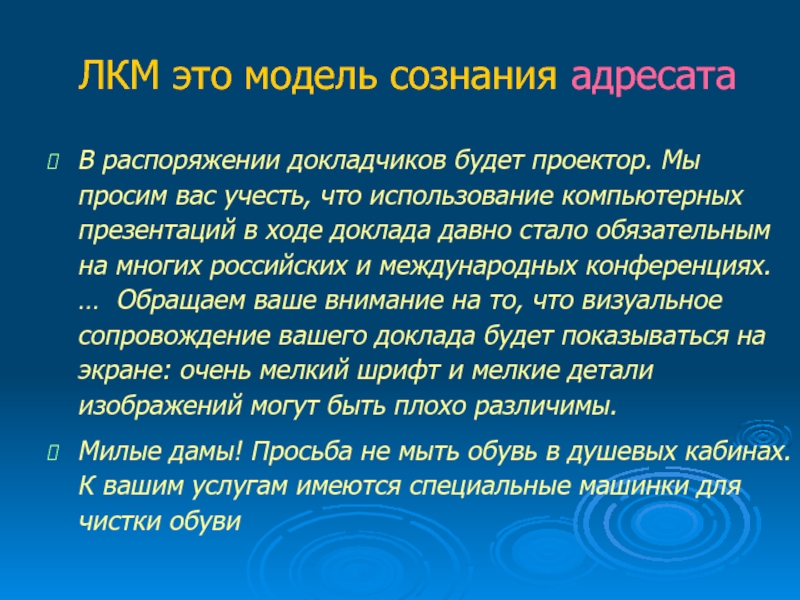 вас учесть, что использование компьютерных презентаций в ходе доклада давно стало обязательным на многих российских и международных конференциях. … Обращаем ваше внимание на то, что визуальное сопровождение вашего доклада будет показываться на экране: очень мелкий шрифт и мелкие детали изображений могут быть плохо различимы.