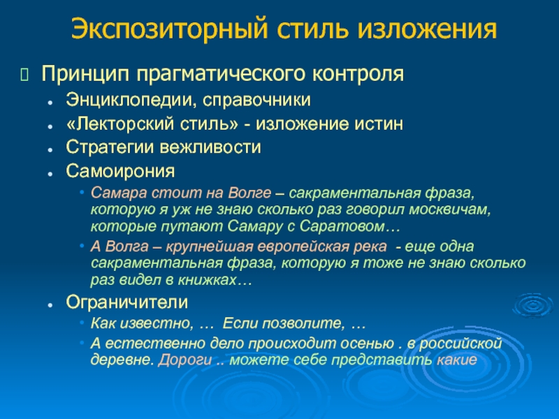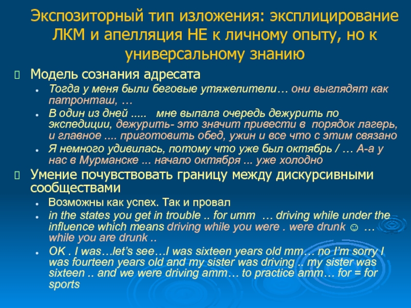 Слайд 20Экспозиторный тип изложения: эксплицирование ЛКМ и апелляция НЕ к личному опыту,