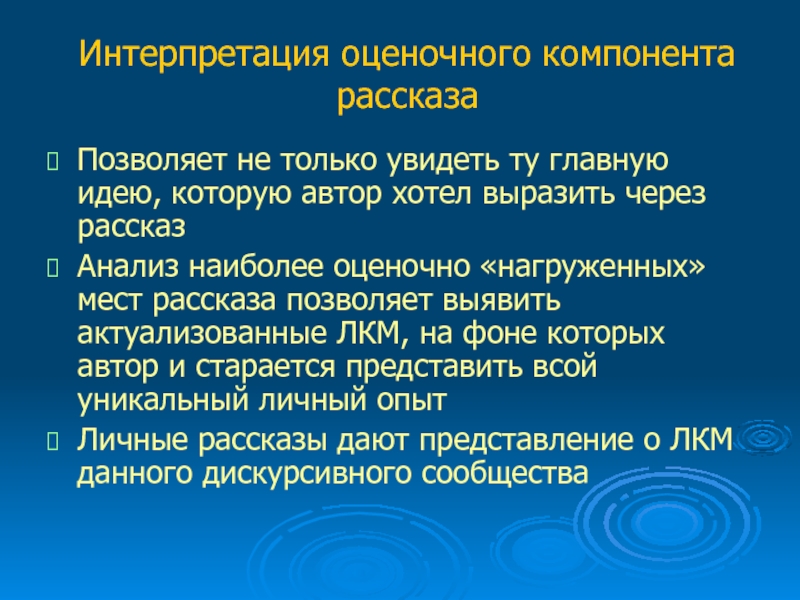 Анализ наиболее оценочно «нагруженных» мест рассказа позволяет выявить актуализованные ЛКМ, на фоне которых автор и старается представить всой уникальный личный опыт