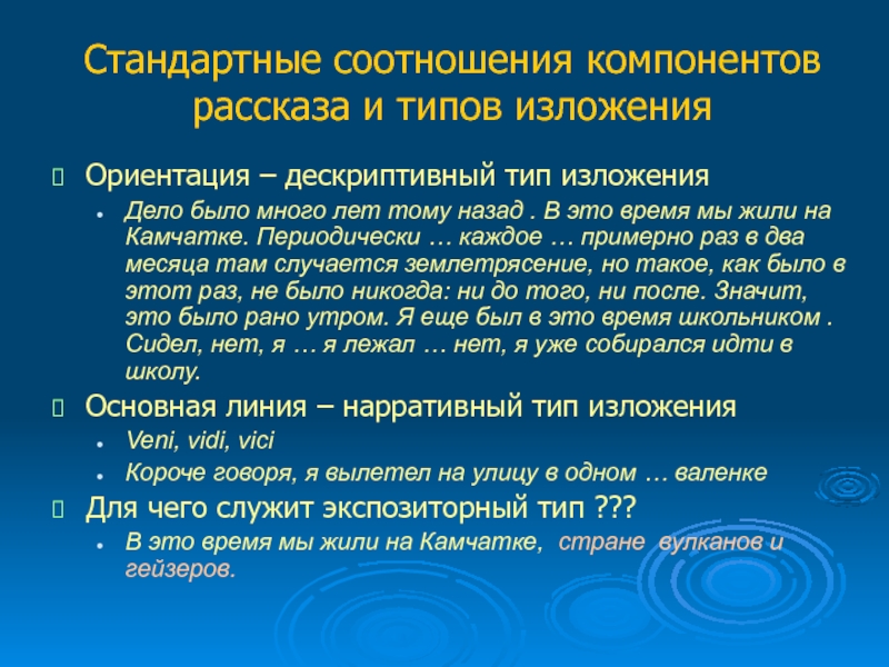 Слайд 18Стандартные соотношения компонентов рассказа и типов изложения