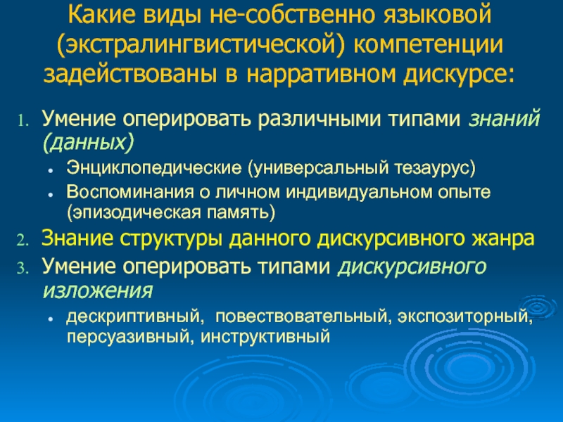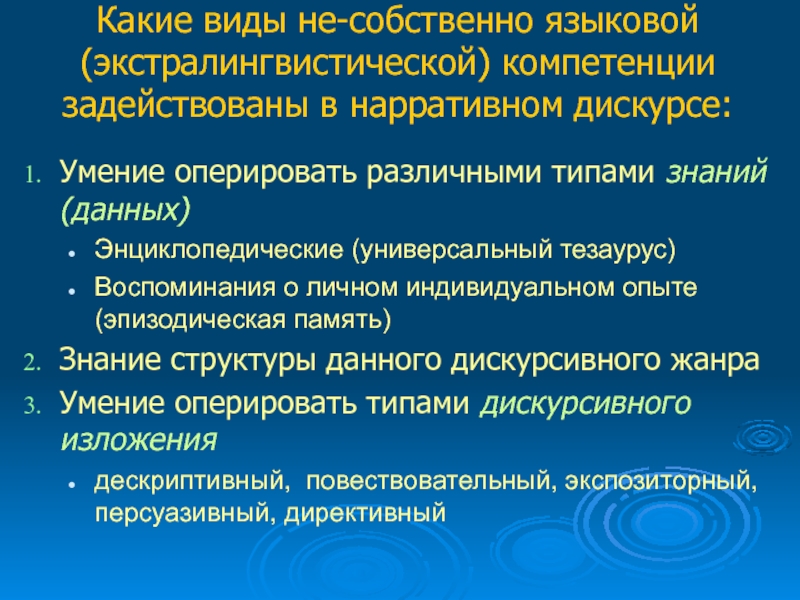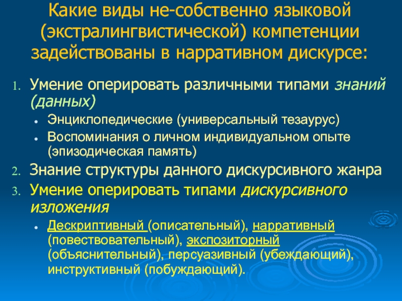 Слайд 4Какие виды не-собственно языковой (экстралингвистической) компетенции задействованы в нарративном дискурсе: