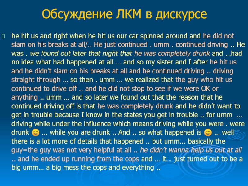 us our car spinned around and he did not slam on his breaks at all/.. He just continued . umm . continued driving .. He was . we found out later that night that he was completely drunk and …had no idea what had happened at all … and so my sister and I after he hit us and he didn’t slam on his breaks at all and he continued driving .. driving straight through … so then . umm … we realized that the guy who hit us continued to drive off .. and he did not stop to see if we were OK or anything .. umm … and so later we found out that the reason that he continued driving off is that he was completely drunk and he didn’t want to get in trouble because I know in the states you get in trouble .. for umm … driving while under the influence which means driving while you were . were drunk ☺ … while you are drunk .. And .. so what happened is ☺ … well there is a lot more of details that happened .. but umm... basically the guy=the guy was not very helpful at all .. he didn’t wanna help us out at all .. and he ended up running from the cops and … it… just turned out to be a big umm… a big mess the cops and everything ..