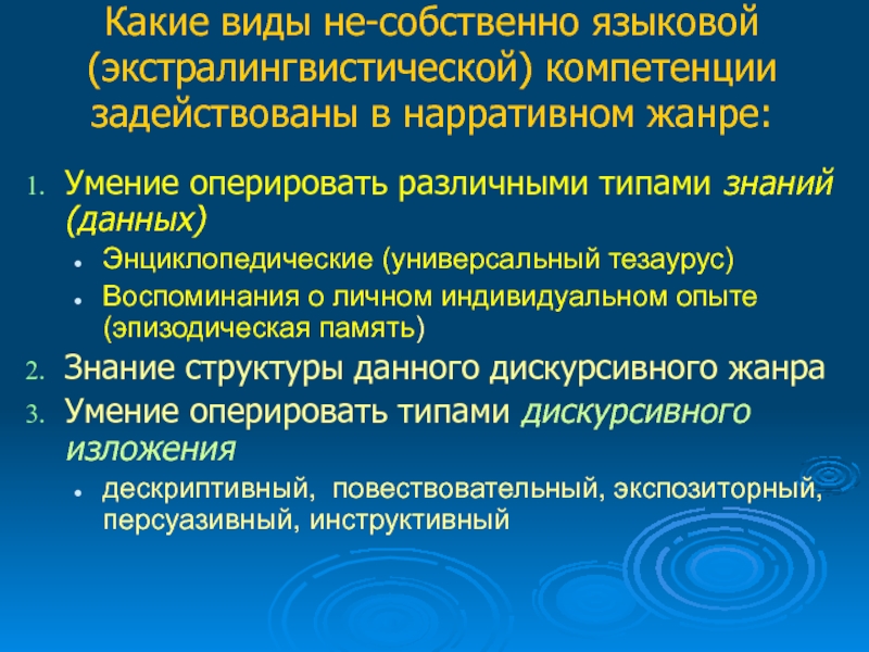 Нарративные жанры: владение структурой жанра, различение универсальных и личных знаний, владение разными типами дискурсивного изложения, …