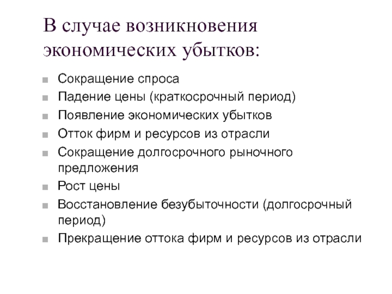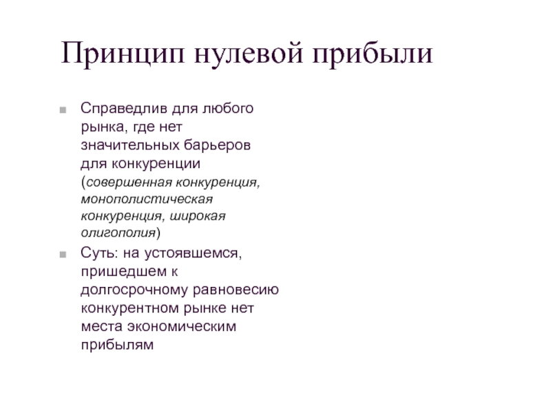 Суть: на устоявшемся, пришедшем к долгосрочному равновесию конкурентном рынке нет места экономическим прибылям