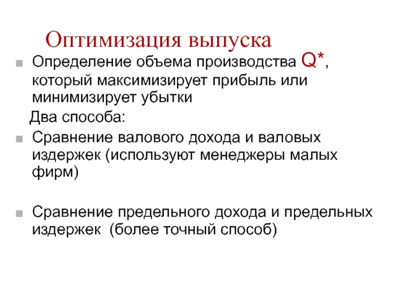 Максимизация прибыли (минимизация убытков) достигается при объеме производства, соответствующем