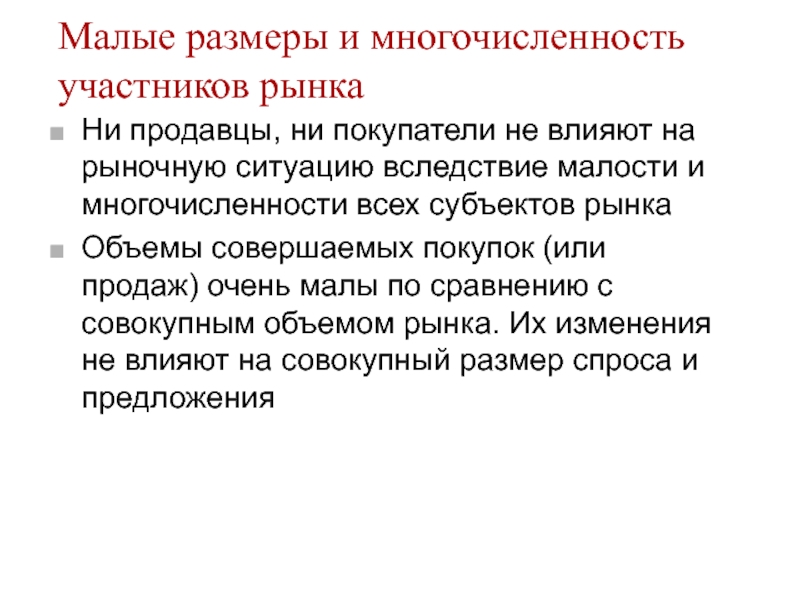 Объемы совершаемых покупок (или продаж) очень малы по сравнению с совокупным объемом рынка. Их изменения не влияют на совокупный размер спроса и предложения