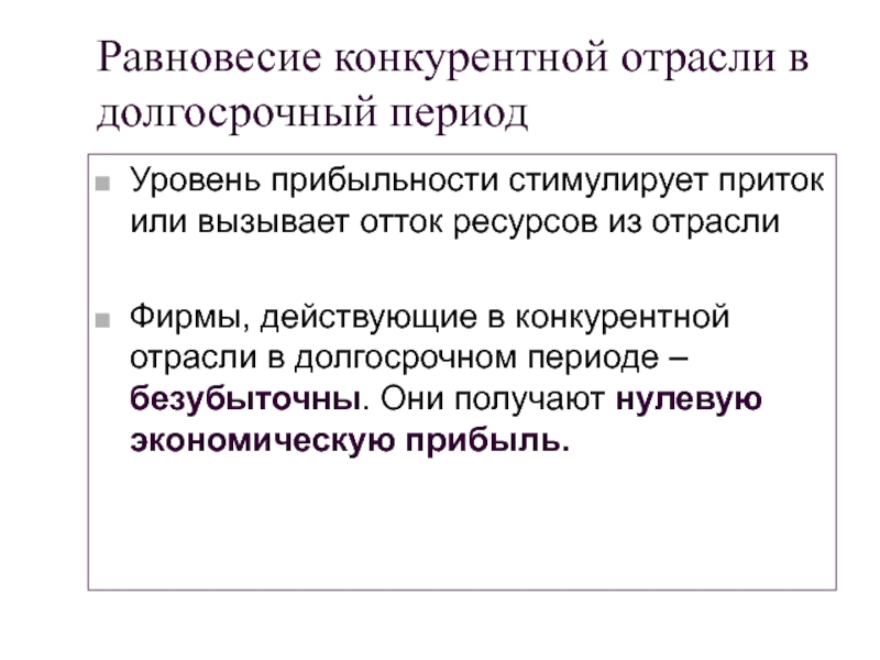 Безубыточность фирм в долгосрочном периоде гарантирует отрасли устойчивость, отсутствует перераспределение прибылей в пользу данной отрасли.