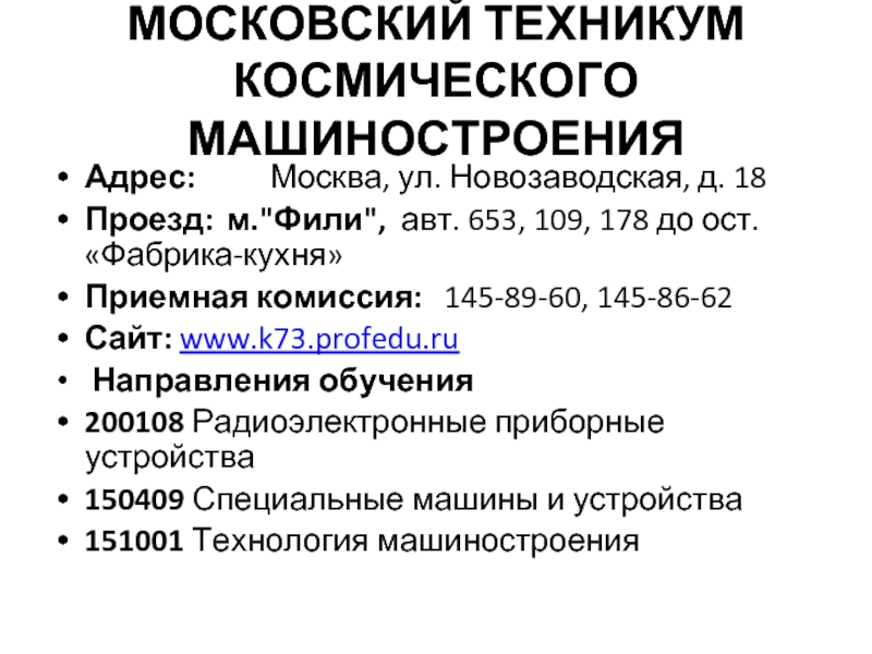 Слайд 11МОСКОВСКИЙ ТЕХНИКУМ КОСМИЧЕСКОГО МАШИНОСТРОЕНИЯ
