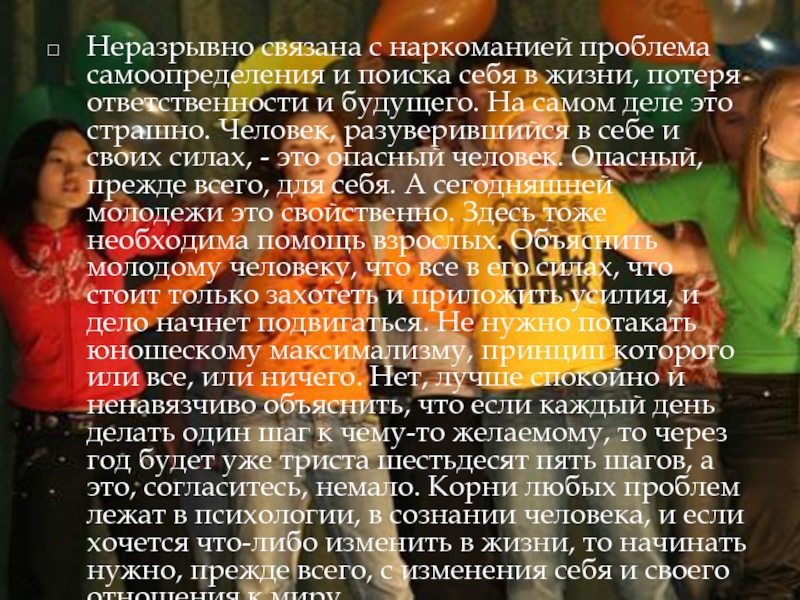 Слайд 4Неразрывно связана с наркоманией проблема самоопределения и поиска себя в жизни,