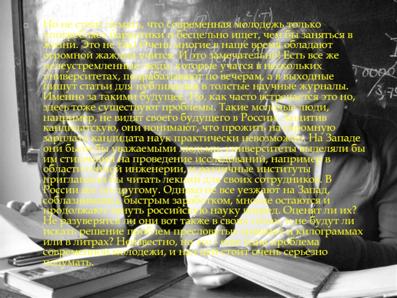 бесцельно ищет, чем бы заняться в жизни. Это не так! Очень многие в наше время обладают огромной жаждой учится. И это замечательно! Есть все же целеустремленные люди, которые учатся в нескольких университетах, подрабатывают по вечерам, а в выходные пишут статьи для публикаций в толстые научные журналы. Именно за такими будущее. Но, как часто встречается это но, здесь тоже существуют проблемы. Такие молодые люди, например, не видят своего будущего в России. Защитив кандидатскую, они понимают, что прожить на скромную зарплату кандидата наук практически невозможно. На Западе они были бы уважаемыми людьми, университеты выделяли бы им стипендии на проведение исследований, например в области генной инженерии, и различные институты приглашали бы читать лекции для своих сотрудников. В России все по-другому. Однако не все уезжают на Запад, соблазнившись быстрым заработком, многие остаются и продолжают тянуть российскую науку вперед. Оценят ли их? Не разуверятся ли они вот также в своих силах, и не будут ли искать решение проблем пресловутых граммах и килограммах или в литрах? Неизвестно, но это - еще одна проблема современной молодежи, и над ней стоит очень серьезно подумать.