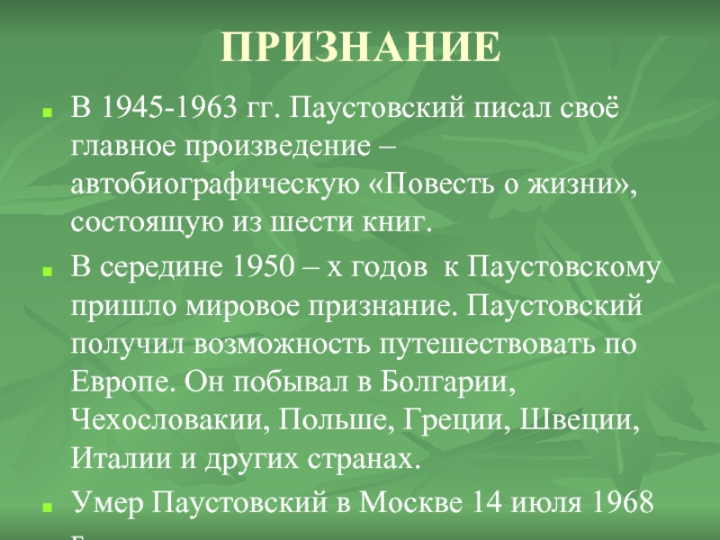 В середине 1950 – х годов к Паустовскому пришло мировое признание. Паустовский получил возможность путешествовать по Европе. Он побывал в Болгарии, Чехословакии, Польше, Греции, Швеции, Италии и других странах.
