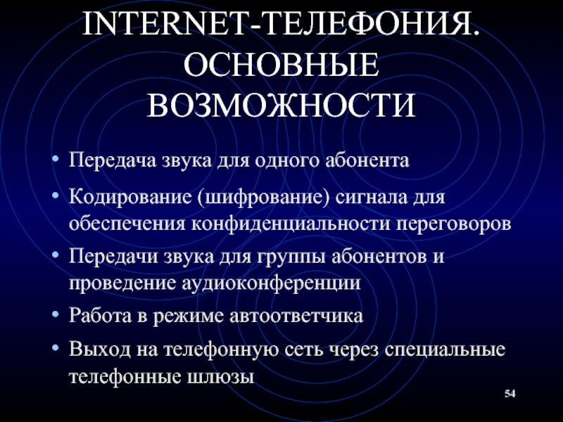 Слайд 54INTERNET-ТЕЛЕФОНИЯ. ОСНОВНЫЕ ВОЗМОЖНОСТИ