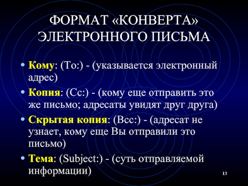 Слайд 13ФОРМАТ «КОНВЕРТА» ЭЛЕКТРОННОГО ПИСЬМА
