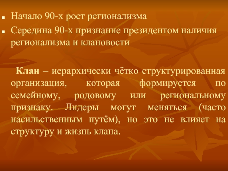 Клан – иерархически чётко структурированная организация, которая формируется по семейному, родовому или региональному признаку. Лидеры могут меняться (часто насильственным путём), но это не влияет на структуру и жизнь клана.