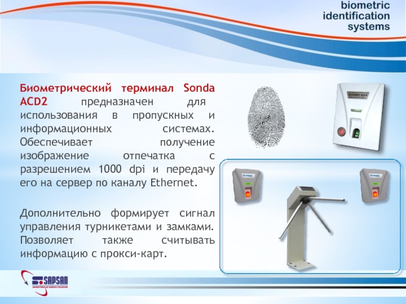 Слайд 4Биометрический терминал Sonda ACD2 предназначен для использования в пропускных и информационных