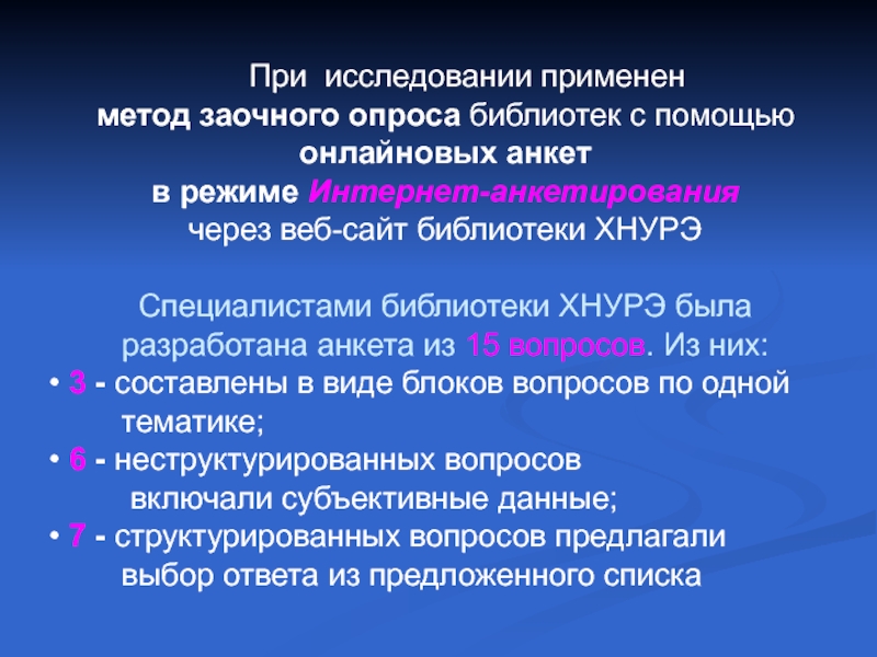 Специалистами библиотеки ХНУРЭ была разработана анкета из 15 вопросов. Из них: