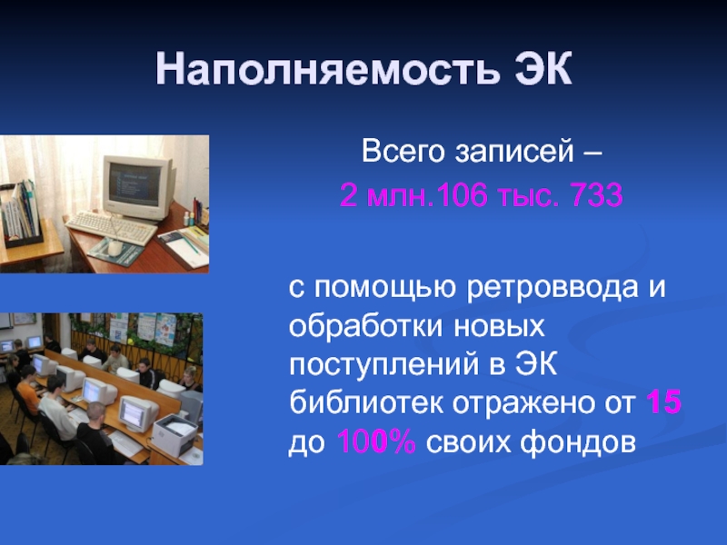 с помощью ретроввода и обработки новых поступлений в ЭК библиотек отражено от 15 до 100% своих фондов