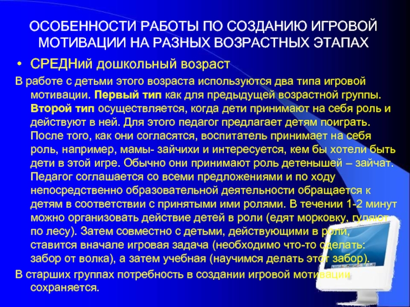 Слайд 17ОСОБЕННОСТИ РАБОТЫ ПО СОЗДАНИЮ ИГРОВОЙ МОТИВАЦИИ НА РАЗНЫХ ВОЗРАСТНЫХ ЭТАПАХ