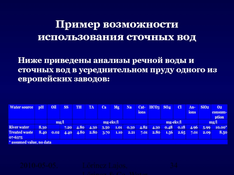 Ниже приведены анализы речной воды и сточных вод в усреднительном пруду одного из европейских заводов: