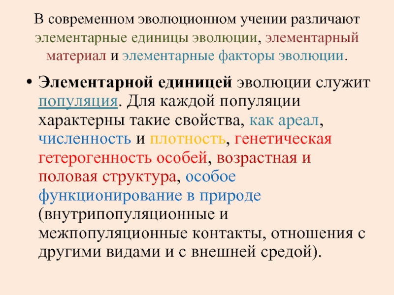 Элементарной единицей эволюции служит популяция. Для каждой популяции характерны такие свойства, как ареал, численность и плотность, генетическая гетерогенность особей, возрастная и половая структура, особое функционирование в природе (внутрипопуляционные и межпопуляционные контакты, отношения с другими видами и с внешней средой).