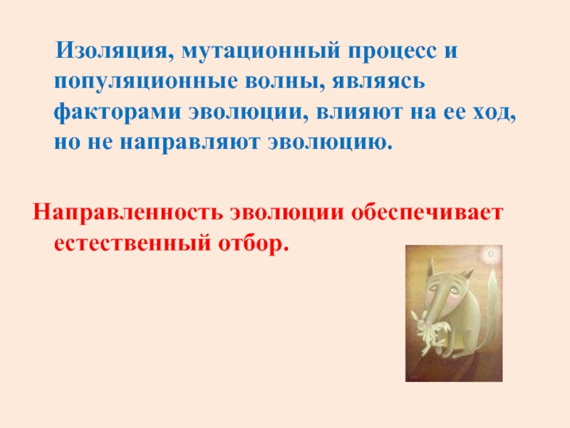 Естественный отбор устраняет из популяции особи с неудачными комбинациями генов и сохраняет особи с генотипами, которые не нарушают процесса приспособительного формообразования. Естественный отбор направляет эволюцию.