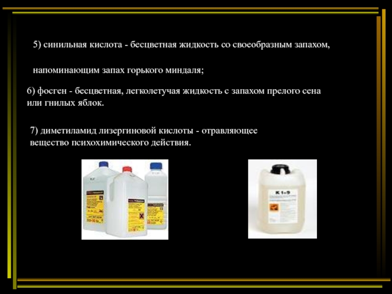 5) синильная кислота - бесцветная жидкость со своеобразным запахом, напоминающим запах горького миндаля;