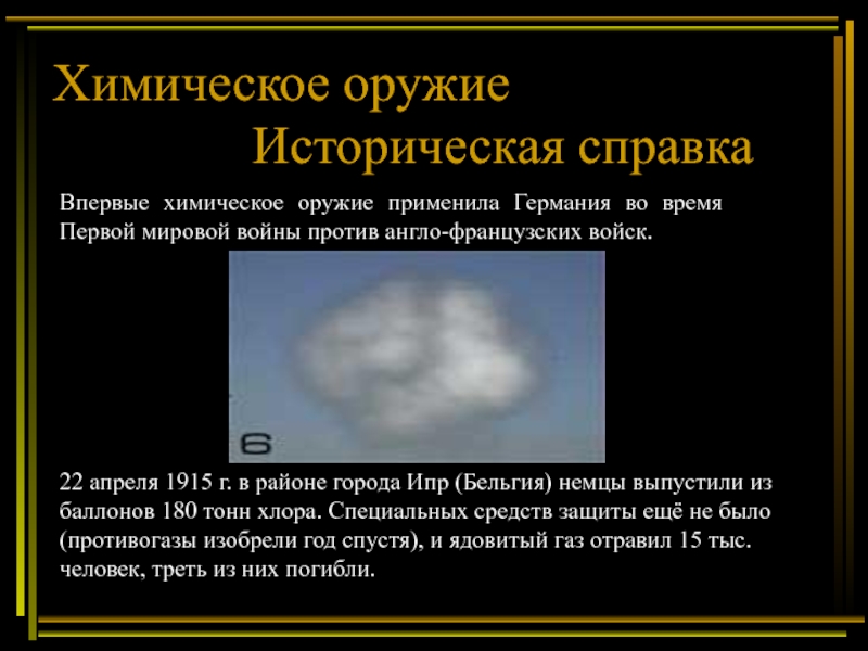22 апреля 1915 г. в районе города Ипр (Бельгия) немцы выпустили из баллонов 180 тонн хлора. Специальных средств защиты ещё не было (противогазы изобрели год спустя), и ядовитый газ отравил 15 тыс. человек, треть из них погибли.