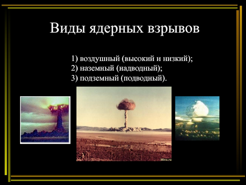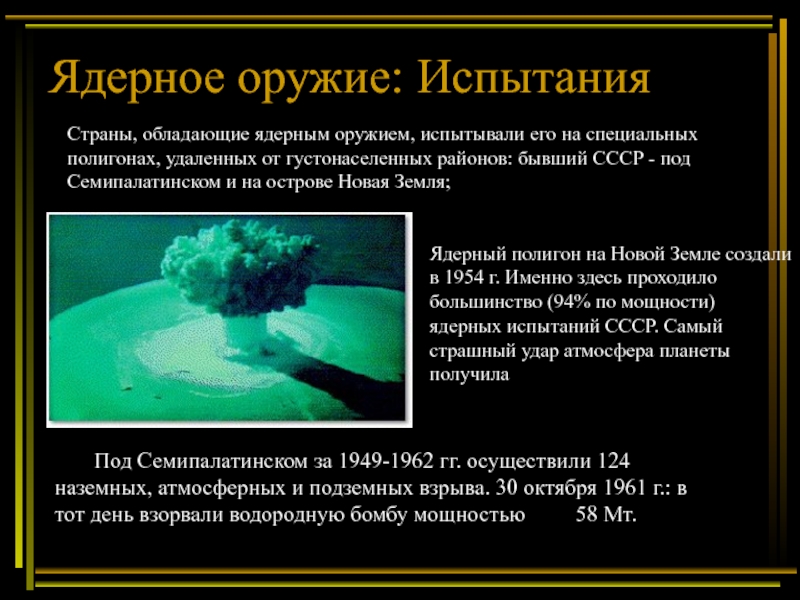 Страны, обладающие ядерным оружием, испытывали его на специальных полигонах, удаленных от густонаселенных районов: бывший СССР - под Семипалатинском и на острове Новая Земля;