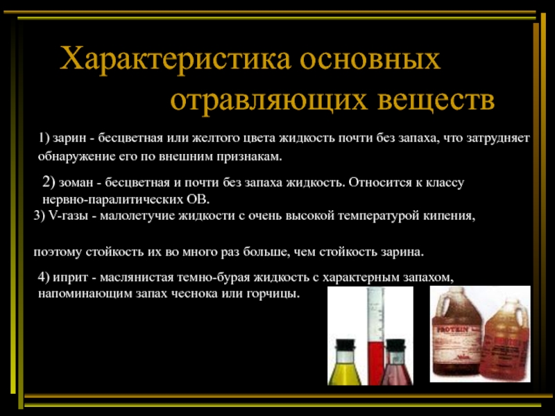 1) зарин - бесцветная или желтого цвета жидкость почти без запаха, что затрудняет обнаружение его по внешним признакам.