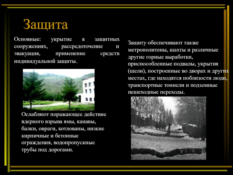 Ослабляют поражающее действие ядерного взрыва ямы, канавы, балки, овраги, котлованы, низкие кирпичные и бетонные ограждения, водопропускные трубы под дорогами.