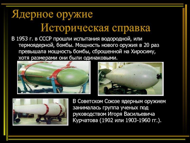 В Советском Союзе ядерным оружием занималась группа ученых под руководством Игоря Васильевича Курчатова (1902 или 1903-1960 гг.).