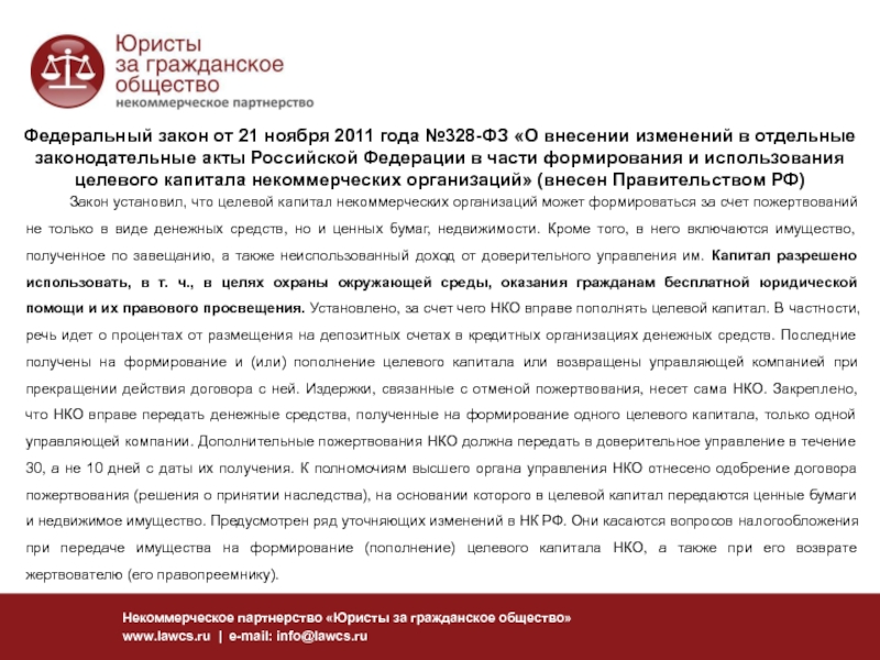 Закон установил, что целевой капитал некоммерческих организаций может формироваться за счет пожертвований не только в виде денежных средств, но и ценных бумаг, недвижимости. Кроме того, в него включаются имущество, полученное по завещанию, а также неиспользованный доход от доверительного управления им. Капитал разрешено использовать, в т. ч., в целях охраны окружающей среды, оказания гражданам бесплатной юридической помощи и их правового просвещения. Установлено, за счет чего НКО вправе пополнять целевой капитал. В частности, речь идет о процентах от размещения на депозитных счетах в кредитных организациях денежных средств. Последние получены на формирование и (или) пополнение целевого капитала или возвращены управляющей компанией при прекращении действия договора с ней. Издержки, связанные с отменой пожертвования, несет сама НКО. Закреплено, что НКО вправе передать денежные средства, полученные на формирование одного целевого капитала, только одной управляющей компании. Дополнительные пожертвования НКО должна передать в доверительное управление в течение 30, а не 10 дней с даты их получения. К полномочиям высшего органа управления НКО отнесено одобрение договора пожертвования (решения о принятии наследства), на основании которого в целевой капитал передаются ценные бумаги и недвижимое имущество. Предусмотрен ряд уточняющих изменений в НК РФ. Они касаются вопросов налогообложения при передаче имущества на формирование (пополнение) целевого капитала НКО, а также при его возврате жертвователю (его правопреемнику).